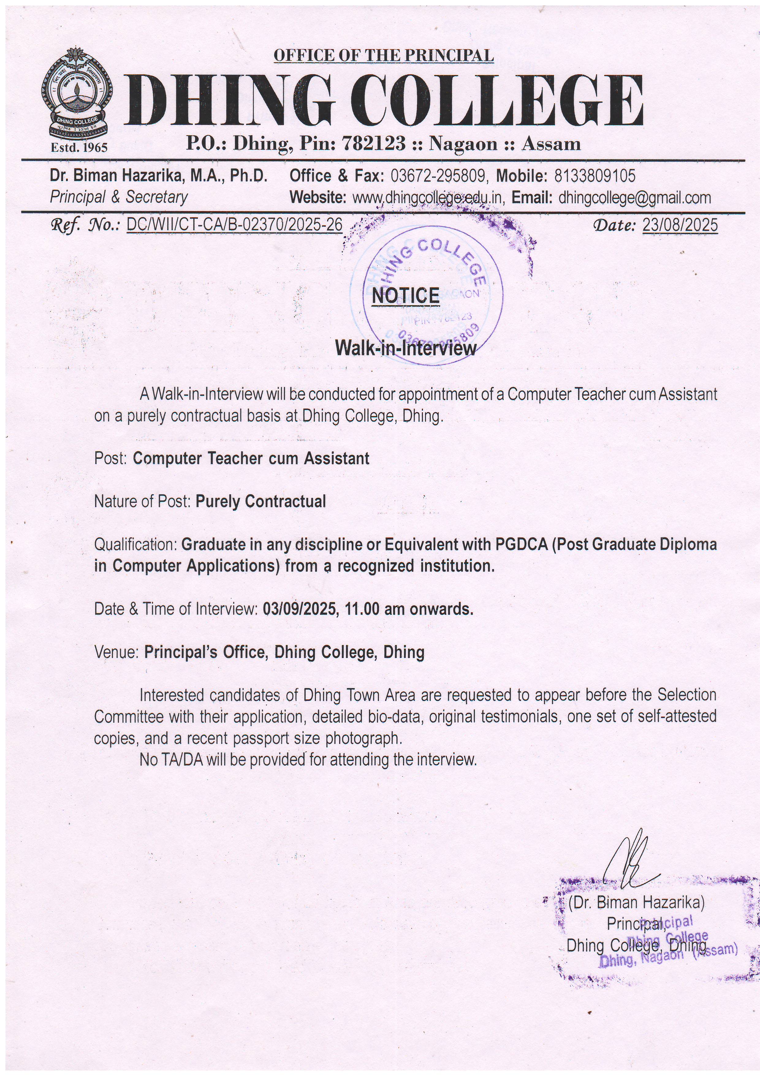 Tentative Comparative Statement of Assistant Professor Botany, Dhing College